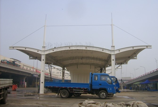 大巴、貨車膜結(jié)構(gòu)車棚,一般來說車棚的沿高度以6m-10m為宜。大車車棚多是用作商貿(mào)中轉(zhuǎn)站,所以不能單單以車高來考量,還要利于裝卸貨方便,而且這樣的地方車輛品種會(huì)非常雜,所以建設(shè)時(shí)要盡量多的留出空間,要往高里建。