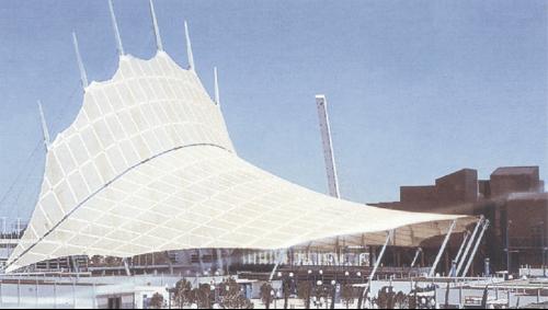 作為理想的膜結(jié)構(gòu)覆蓋材料,膜材輕質(zhì)高強(qiáng),中等強(qiáng)度的PVC膜,其厚度僅0.61mm,但它的拉伸強(qiáng)度已達(dá)到鋼材的水平。膜材還對(duì)自然光有反射、吸收和透射能力;它不燃、難燃或阻燃,具有耐久、防火、氣密良好等特性;表面經(jīng)處理(涂覆PVC或PVDF等)的膜材,自身不發(fā)粘,有很好的自潔性能。在環(huán)保方面,目前開發(fā)使用的ETFE膜材,已經(jīng)能達(dá)到100%回收再利用。膜材滿足如此多的苛刻條件,加上科學(xué)合理的鋼結(jié)構(gòu)支撐,膜結(jié)構(gòu)能變成各種藝術(shù)造型也就不足為奇了。
