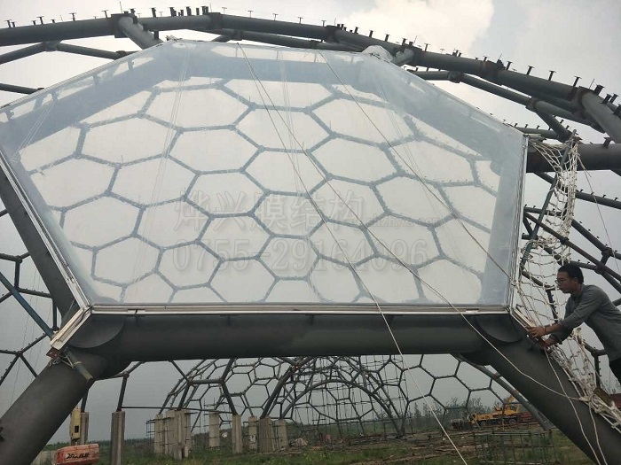 燁興連云港薔薇湖ETFE膜結(jié)構(gòu)生態(tài)園項目,一期工程9416平方米,外形是三個連接在一起的半球空間,此次初裝膜的是1#球(直徑跨度60米)。