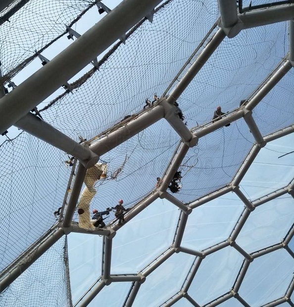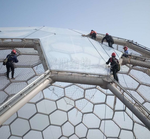 戶外高空作業(yè)環(huán)境下的低溫、雨雪天氣一直是ETFE氣枕膜裝膜過程中面臨的主要難題。雨雪天氣時,基本所有工作都要停工;面對高空作業(yè),只要嚴格執(zhí)行高空作業(yè)規(guī)程,提供安全可靠的防護措施(如穿戴安全繩和加裝安全網(wǎng)),就能保證順利作業(yè);當氣溫低于5℃時,對ETFE膜結(jié)構工程來說,是不適合繼續(xù)作業(yè)的,春節(jié)期間,連云港當?shù)貧鉁刈畹驮诹愣纫韵?,為此,我們的工人只能利用白天正午時分氣溫大幅上升那段時間作業(yè),效率較低。