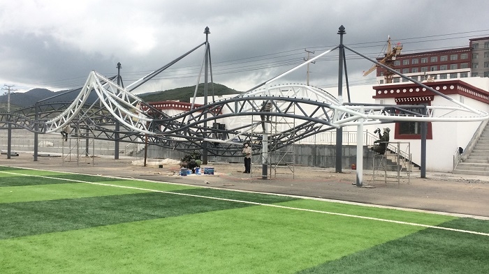 燁興-甘南體育看臺(tái)是深圳市燁興膜結(jié)構(gòu)工程有限公司為甘肅甘南州中等職業(yè)學(xué)校打造的膜結(jié)構(gòu)體育看臺(tái),項(xiàng)目設(shè)計(jì)、施工及相關(guān)材料服務(wù)都是由燁興膜結(jié)構(gòu)提供。目前,項(xiàng)目鋼結(jié)構(gòu)已經(jīng)在現(xiàn)場(chǎng)拼裝完成,正等待吊裝到位,然后進(jìn)行膜布張拉。