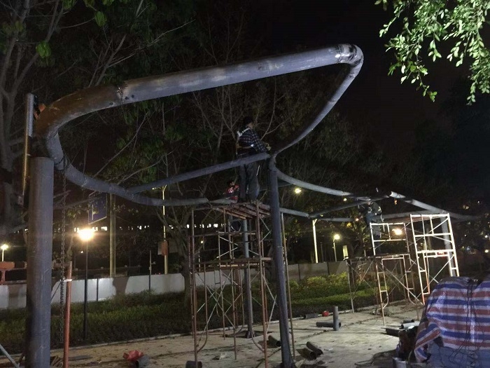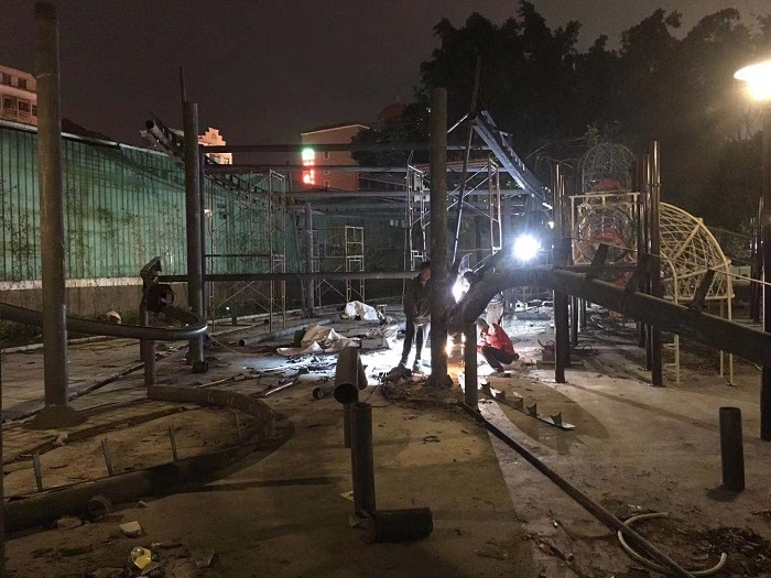 在施工方面,細(xì)節(jié)把控很重要。兒童公園這樣的場(chǎng)地,小孩子跑動(dòng)打鬧是很頻繁的,非常容易發(fā)生碰撞或者摔倒事件。所以在施工中,我們一定要根據(jù)現(xiàn)場(chǎng)環(huán)境,靈巧地將支撐鋼構(gòu)融入現(xiàn)場(chǎng)設(shè)施中,降低支撐結(jié)構(gòu)的存在感,減少接觸面,做一些防護(hù)設(shè)施降低熊孩子的攀爬欲望。特別注意的是,現(xiàn)場(chǎng)鋼構(gòu)拼裝完工后,一定要檢查打磨毛刺或者其它尖銳突出點(diǎn),防止觸碰受傷。