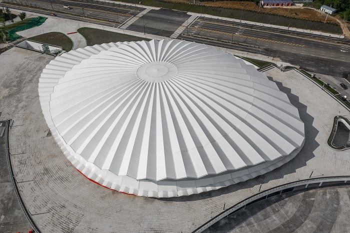 京山網(wǎng)球館最考驗(yàn)技術(shù)的是扇貝造型的塑造呈現(xiàn)。設(shè)計(jì)一個(gè)擬形建筑時(shí),需要提煉事物特征,化繁為簡,在“形似”、“神似”和施工可操作性之間找到一個(gè)平衡點(diǎn)。在燁興設(shè)計(jì)及施工團(tuán)隊(duì)夜以繼日的努力下,京山網(wǎng)球館膜結(jié)構(gòu)工程近乎完美。從完工后拍攝的視頻圖片可以看到,這個(gè)精工細(xì)制的巨大貝殼狀建筑,紋路起伏清晰,線條簡潔優(yōu)美,從“形”到“神”都給人傳達(dá)了強(qiáng)烈的建筑印象,已經(jīng)成了當(dāng)?shù)氐囊坏烂利愶L(fēng)景。