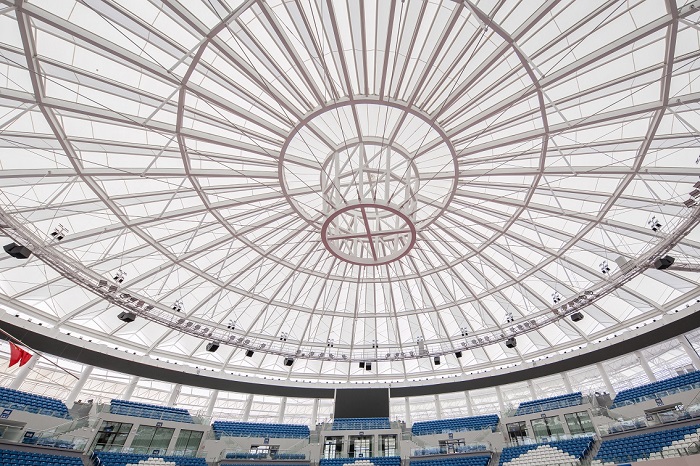 工程特點(diǎn):京山國際網(wǎng)球賽事中心膜結(jié)構(gòu)館,外形是兩個(gè)疊在一起的潔白扇貝殼,設(shè)計(jì)使用壽命在20年以上,能有效抵御9級(jí)以下地震。球館采用鋼結(jié)構(gòu)加PTFE膜的形式,內(nèi)部是寬敞的無立柱空間,各個(gè)座位的觀眾都能獲得良好的觀賽體驗(yàn);頂部的PTFE膜在將大部分紫外線紅外線隔絕之后,落在場(chǎng)館內(nèi)的是溫和的自然光,使場(chǎng)館內(nèi)白天時(shí)不開燈也光線明亮,比傳統(tǒng)的封閉建筑節(jié)能30%以上。